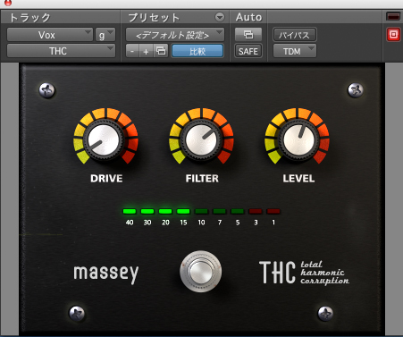 Massey-Plugins の THC です。 このメーカーは Steven Massey という技術者が個人でやっているため、ダウンロード販売のみで しかも安価、この THC はなんとわずか $69 です。 他にもいくつかのプラグインがだいたい同じような値段であり、リミッター L2007 やアナログ・シミュレータ Tape Head、コンプ CT4、EQ vt3 は普段のミックスやマスタリングにおいてもよく使っています。 この THC は歪み倍音を付加するプラグインで、その歪み方はかなり過激かつ独特のものです。 ミックス本でも紹介していますが、こういった過激な音になるプラグインはコピー・トラックに挟んで元の音に足していく、というのが使いやすいです。 女性ヴォーカルに使うと曲によってはかなり効果的で、以前シンガー 青木カレンさんの声にもたまに使ってました。 |