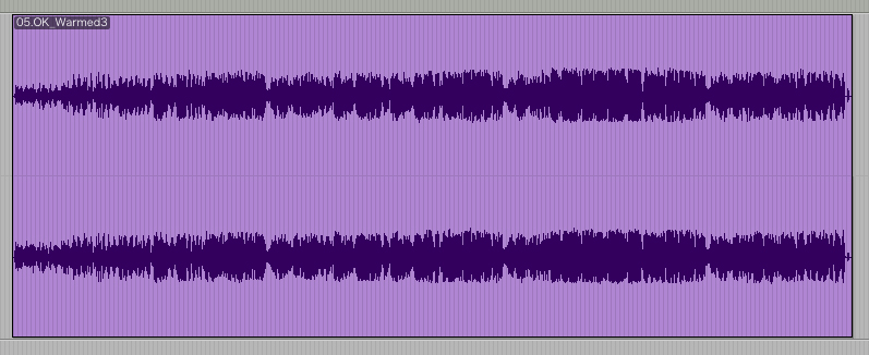 そうして出来上がったマスタリング済み最終ファイルの波形が下の写真です。 不思議なことに、輸入盤で積み込み過ぎたダイナミクスがだいぶ戻り、アコースティックな雰囲気にすることに成功しました。 |