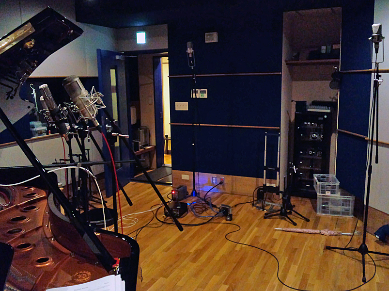 まずはメイン・ブースでのピアノ収録の様子が下の3枚、クリックすると拡大します。